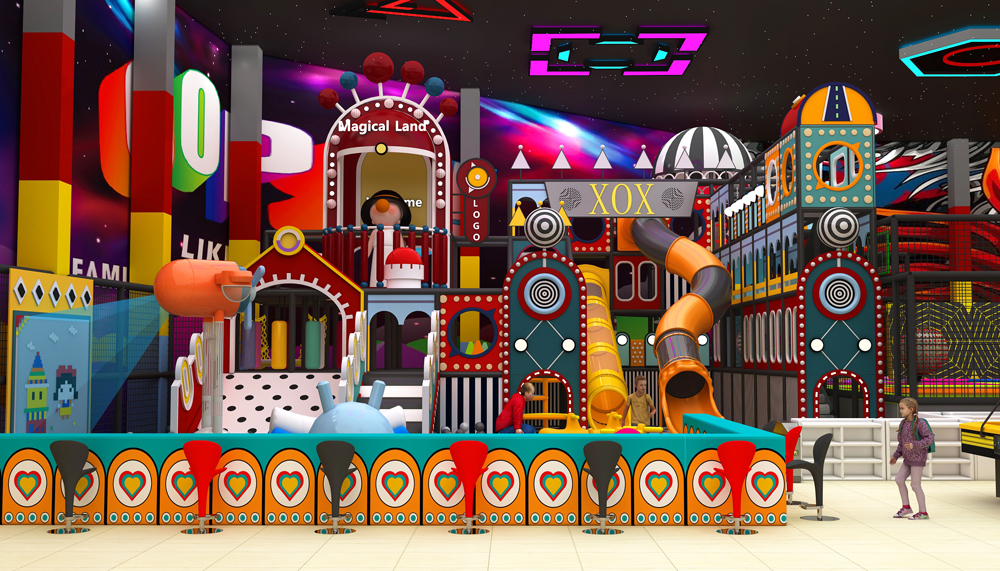 淘氣堡設備既含有前幾代兒童樂園的各種游戲主項目(例如:蹦蹦床、海洋球池、空中滑車、獨木橋、鐵索橋、駕駛倉、螺旋滑道、滑管、彩虹梯、攀巖、天外飛碟、卡賓槍、加農炮、自動槍、卡通隔排等),又新增了空中轎車、火山爆發、動物噴球和一些電動玩具(例如:電動椰子樹、旋轉木馬、電動八爪魚、彩虹樹等)等項目。主項目能讓兒童在體能上有全面的鍛煉,肢體動作得到發展,激發兒童積極進取精神和戰勝困難的勇氣。而新增的電動玩具項目產品做工精細,工藝先進采用進,阻燃毛絨原料和精密電子元件,動物叫聲添加歡快兒歌,更加吸引小朋友,所售之處皆受小朋友的喜愛。